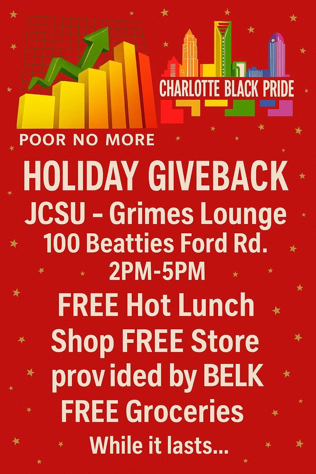 On Saturday, December 6, 2025, from 2 to 5 p.m., in collaboration with Charlotte Black Pride, Poor No More is holding a Holiday Giveback at Johnson C. Smith University’s Grimes Lounge, 100 Beatties Ford Road, Charlotte, North Carolina.