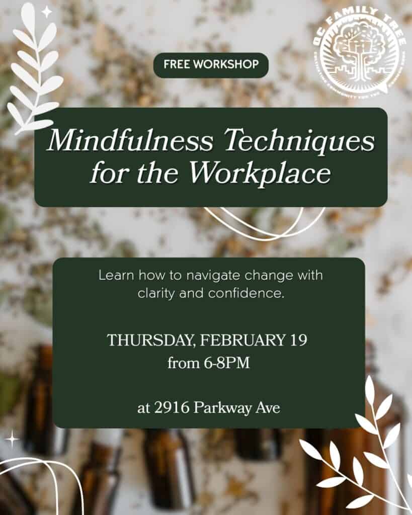 QC Family Tree is presenting a free workshop, Mindfulness Techniques for the Workplace, on Thursday, February 19, 2026, from 6 to 8 p.m., at Marian House, 2916 Parkway Avenue, Charlotte, North Carolina. Follow the above link to register.