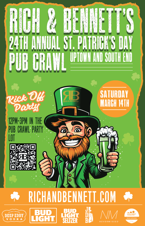 Pub crawls abound on St. Patrick’s Day, but the granddaddy of them all in Charlotte is Rich & Bennett. The 23rd Annual Rich & Bennett’s St. Patrick’s Day Pub Crawl takes place Saturday, March 15, 2025.