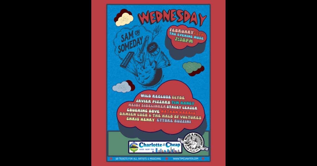 The next Sam on Someday will be at The Evening Muse, 3227 N Davidson Street, Charlotte, North Carolina, on Wednesday, February 25, 2026, at 7:30 p.m. Doors open at 7 p.m.