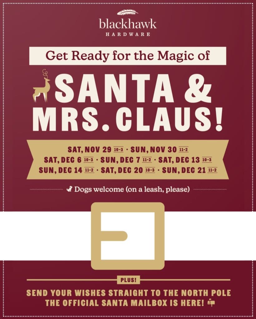 Santa and Mrs. Claus will be at Blackhawk Hardware, at Park Road Shopping Center, 4225 Park Road, Charlotte, North Carolina, every Saturday and Sunday from November 29 to December 21, 2025.