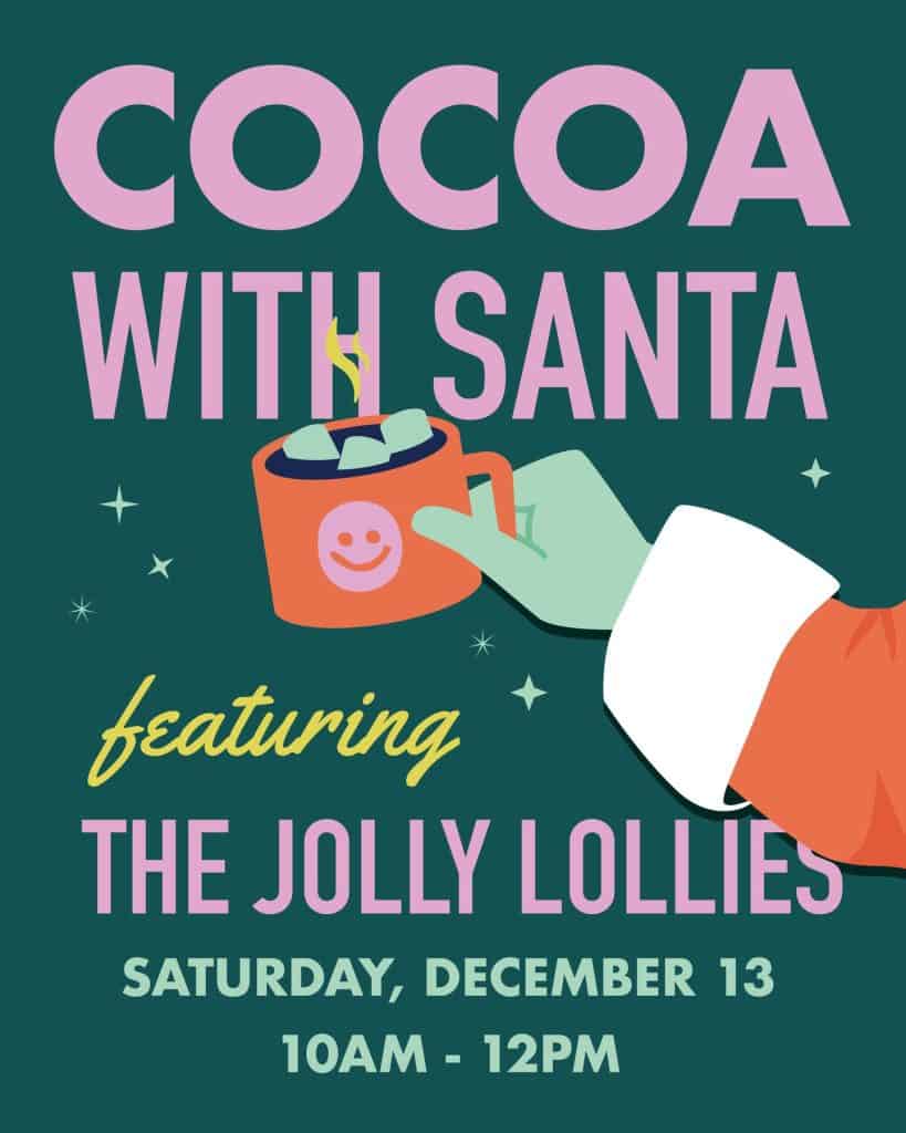 Then enjoy the FREE hot cocoa bar, and sing-along tunes with The Jolly Lollies. The event ends at 12 p.m.