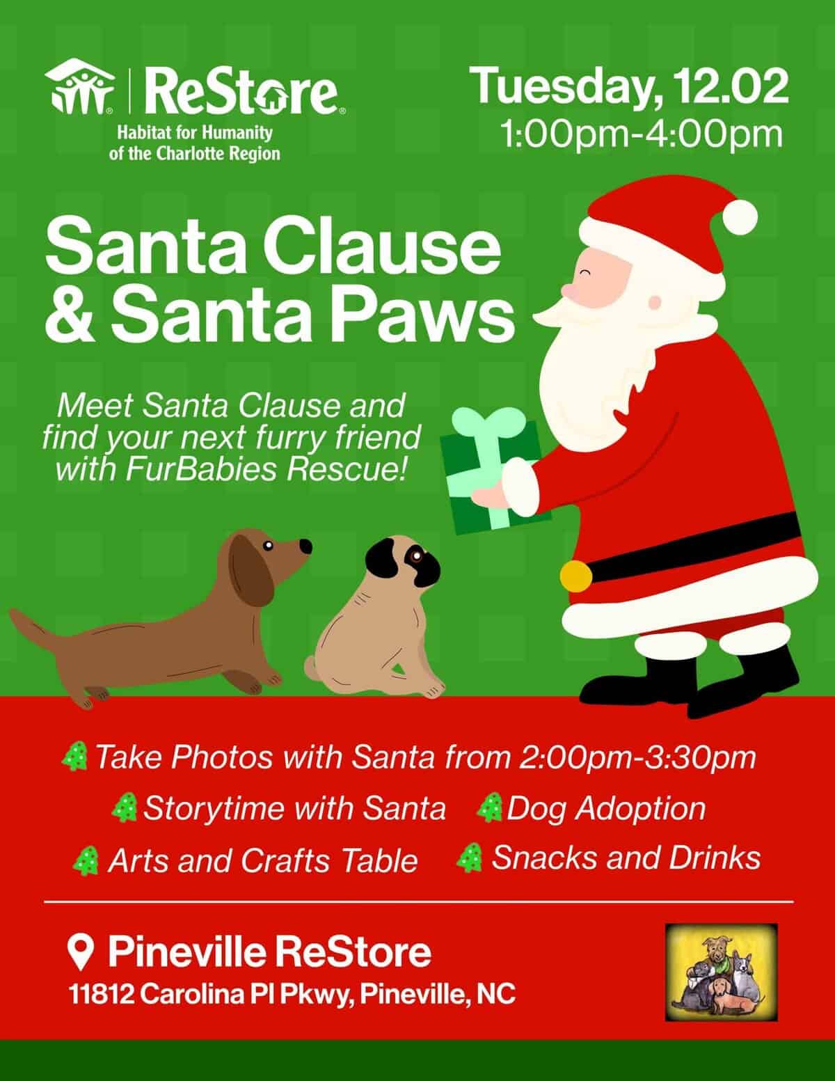 ReStore, at 11812 Carolina Place Parkway, Pineville, North Carolina, is hosting a FREE holiday event, Santa Claus and Santa Paws, on Tuesday, December 2, 2025, from 1 to 4 p.m.
