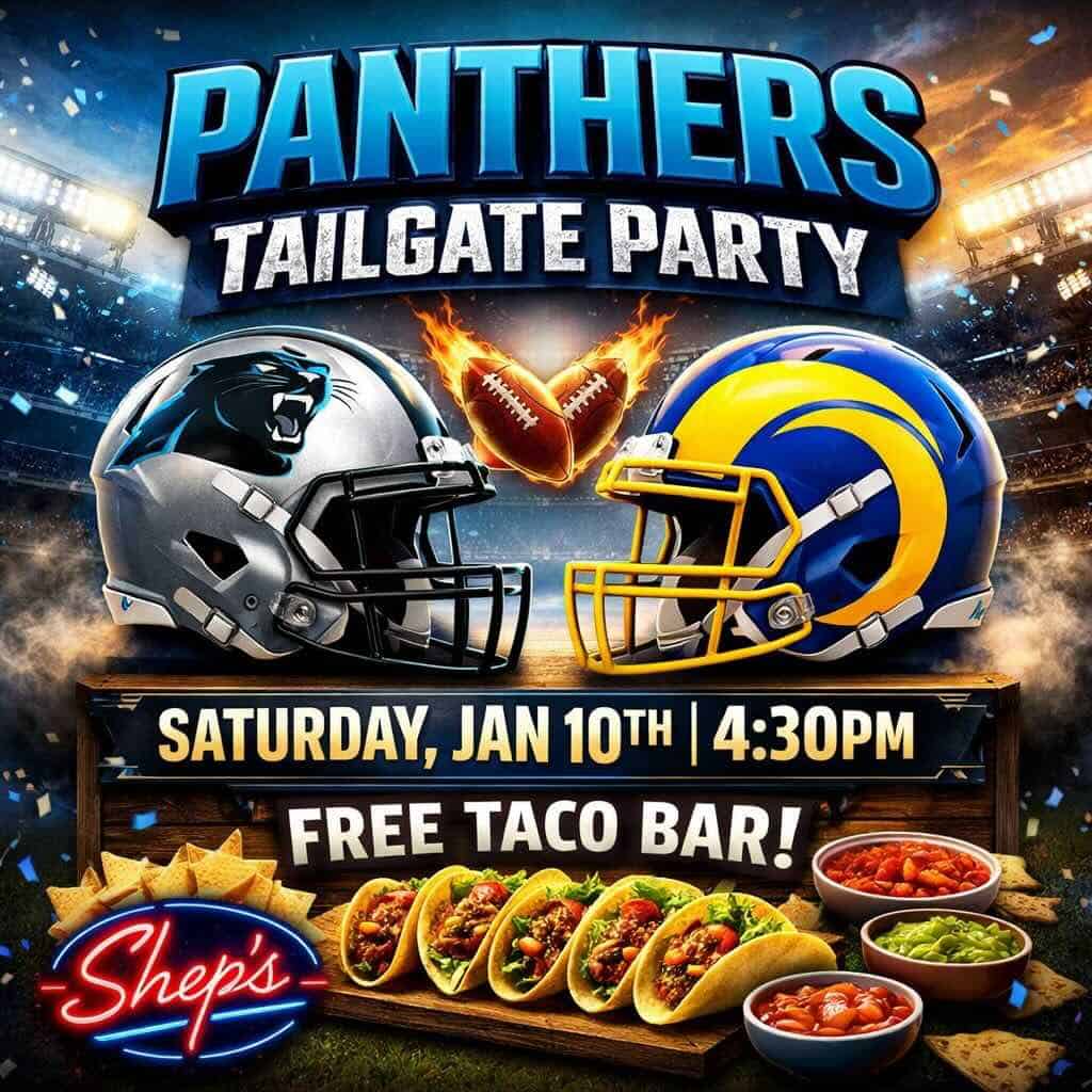 Shep’s Bar & Grill, 8111 Fairview Road, Mint Hill, North Carolina, is hosting a full-on Panthers tailgate party for their Wildcard game against the Rams on Saturday, January 10, 2026, at 4:30 p.m.