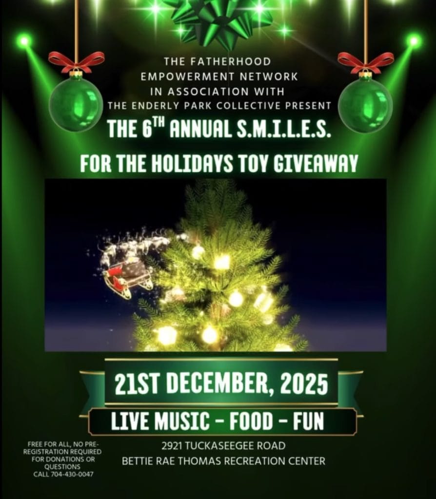The Father Empowerment Network and The Enderly Park Collective present the 6th annual S.M.I.L.E.S. Toy and Winter Items Giveaway on December 21, 2025, from 2to 5 p.m., at Bette Rae Thomas Recreation Center, 2921 Tuckaseegee Road, Charlotte, North Carolina.