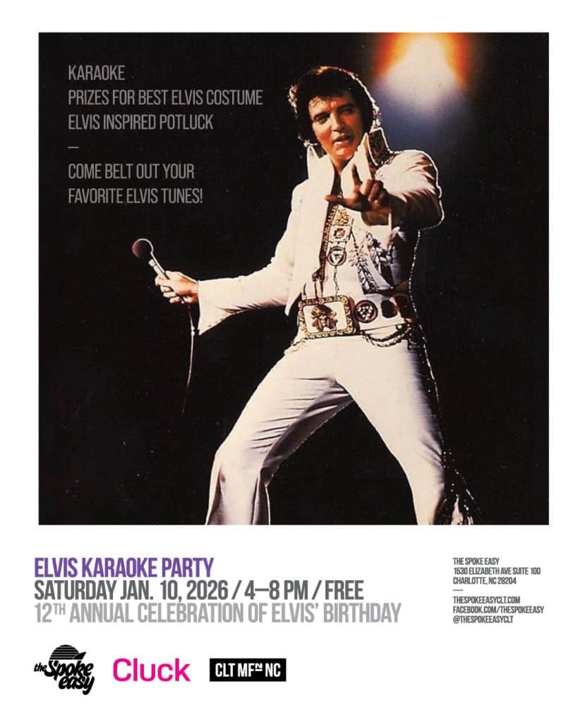 The Spoke Easy, at 1530 Elizabeth Avenue, Suite 100, Charlotte, North Carolina, is hosting its 12th Annual Elvis Party on Saturday, January 10, 2026, from 4 to 8 p.m.
