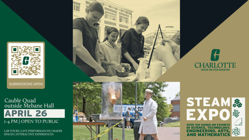 UNC Charlotte’s STEAM Expo takes place April 26, 2026, from 12 to 4 p.m., on Cauble Quad, between between Mebane Hall (Cato College of Education), the College of Health and Human Services Building, Barnhardt Student Activities Center, and Woodward Hall. 8838 Craver Rd, Charlotte, North Carolina.