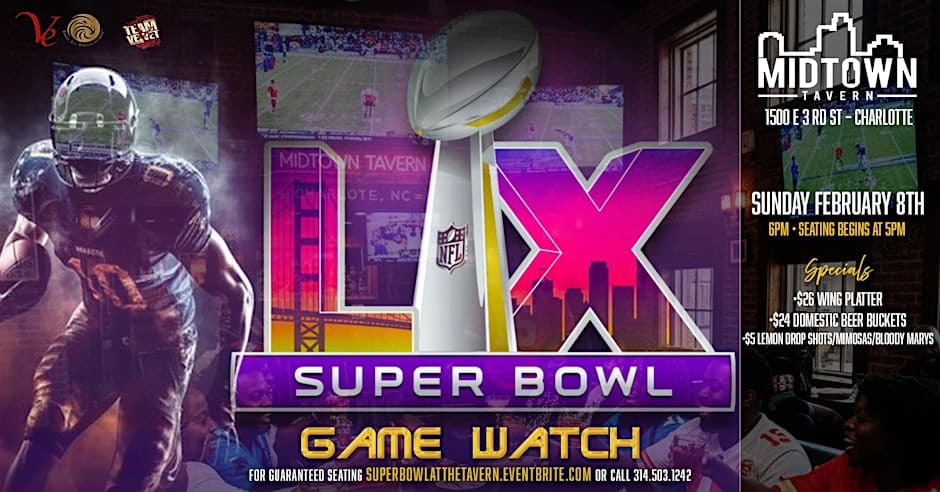 Midtown Tavern,1500 E 3rd Street, Charlotte, NC, is hosting a Super Bowl Watch Party on Sunday, February 8, 2026, at 6 p.m.