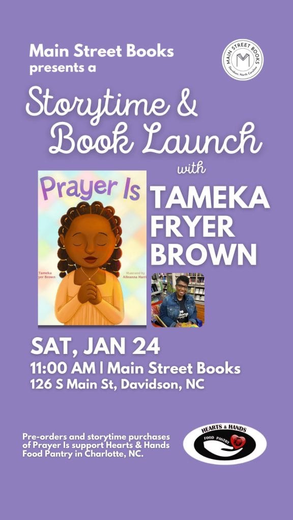 Main Street Books, 126 S Main Street, Davidson, North Carolina, is presenting a Storytime and Book Launch with Tameka Fryer Brown on Saturday, January 24, 2026, at 11 a.m. This is a chance to be among the first to experience Brown’s new book, Prayer Is.