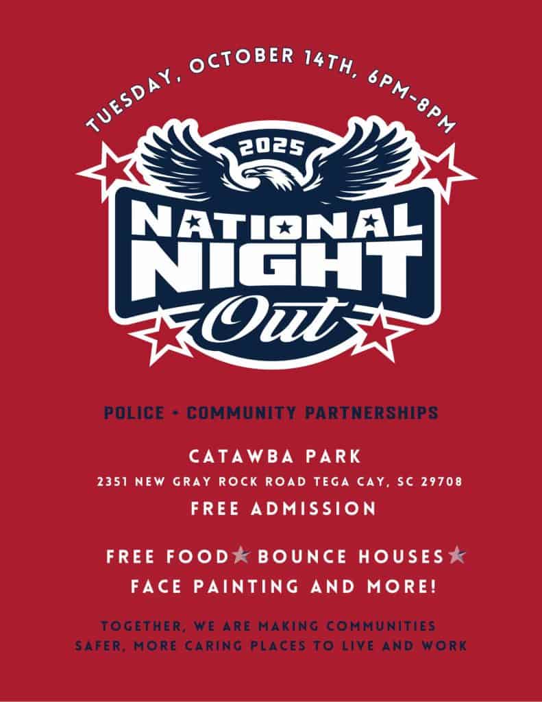 City of Tega Cay is holding its National Night Out on Tuesday, October 14, 2025, from 6 to 8 p.m., at Catawba Park, 2351 New Gray Rock Road, Tega Cay, South Carolina.