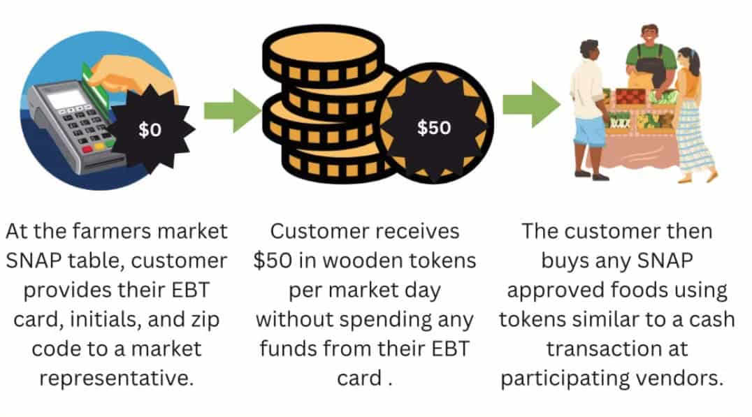 A temporary SNAP incentive model offering SNAP customers $50 in farmers’ market tokens will take place at participating farmers markets during the month of November, 2025. Please note that the list of participating farmers’ market is not as extensive as the list of farmers’ markets that normally participate in the Double Bucks program. Jump to the list of farmers’ markets.