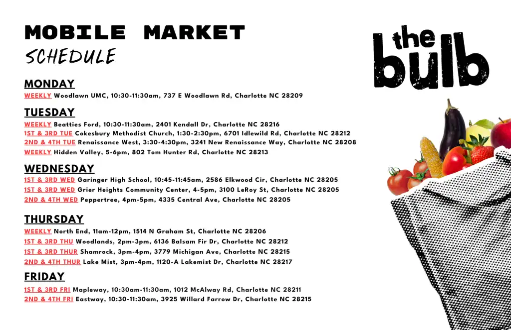 You can even donate excess produce from your home garden. Just drop it off at The Bulb’s headquarters at Innovation Barn, 932 Seigle Avenue, Charlotte, NC, Monday to Friday from 9 a.m. to 4 p.m. Please make sure to check their website for any changes to this schedule.