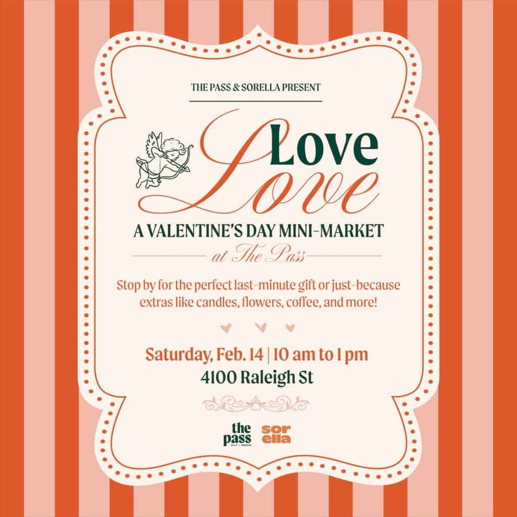 The Pass CLT, at 4100 Raleigh Street, Charlotte, North Carolina, is hosting Love Love — A Valentine’s Day Mini Market on Saturday, February 14, 2026, from 10 a.m. to 1 p.m.