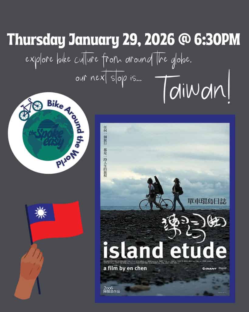 This is Spoke Easy’s first Bike Around the World event for 2026. The focus is Taiwan. at this event there will be a potluck with the theme of Taiwan, and a screening of the movie Island Etude.