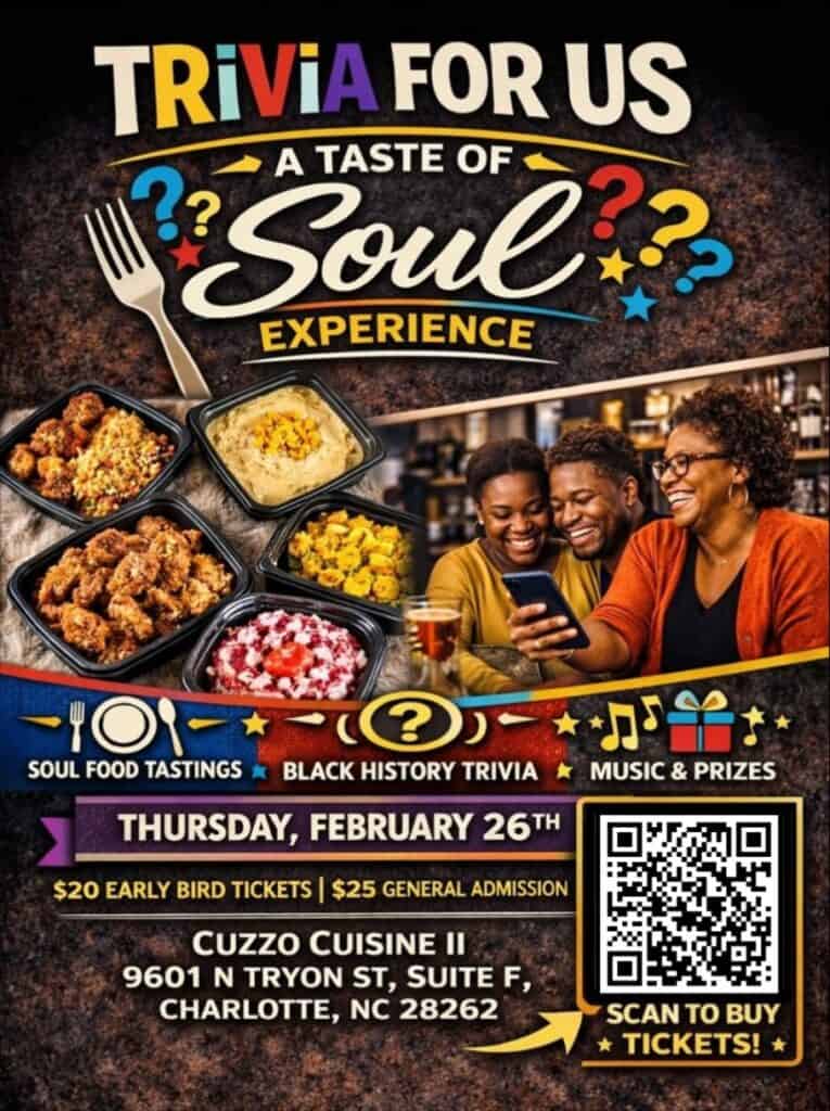 Trivia for Us: Black History Month “A Taste of Soul” is a celebration of knowledge and food on Thursday, February 26, 2026, from 7 to 9:30 p.m. at Cuzzo’s Cuisine II, 9601 N Tryon Street, Charlotte, North Carolina.