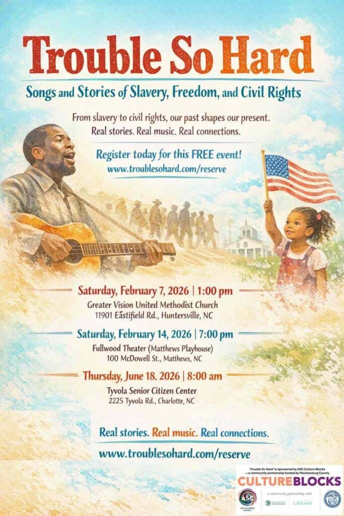You’ll have two chances to see Trouble So Hard in the Charlotte area during Black History Month, February of 2026. Both are free to attend, but you need to register.