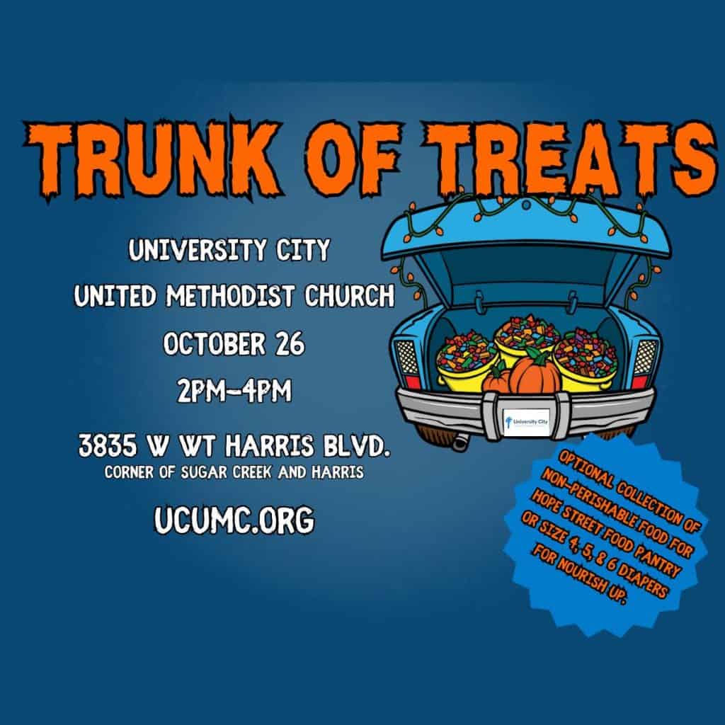 University City United Methodist Church, 3835 WT Harris Blvd, Charlotte, North Carolina, is hosting Trunk of Treats on Sunday, October 26, 2025, from 2 to 4 p.m.