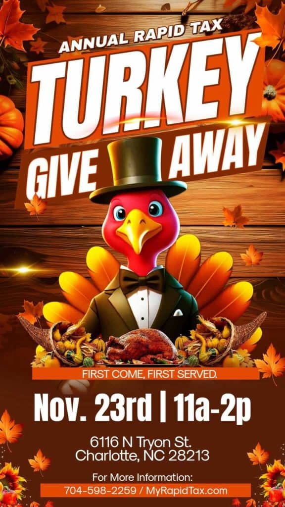 Rapid Tax, at 6116 N Tryon Street, Charlotte, North Carolina, is hosting a Turkey Giveaway on Sunday, November 23, 2025, from 11 a.m. to 2 p.m., while supplies last.