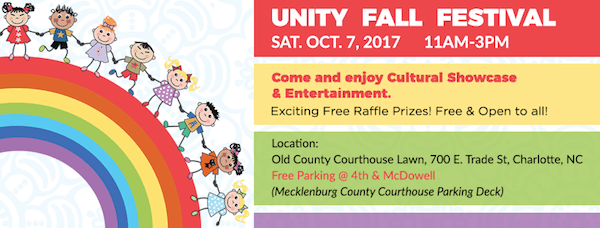 The Unity Fall Festival will take place on Saturday, October 7th, 2017, from 11 a.m. to 3 p.m., on the lawn of the Old County Courthouse, 700 East Trade Street.