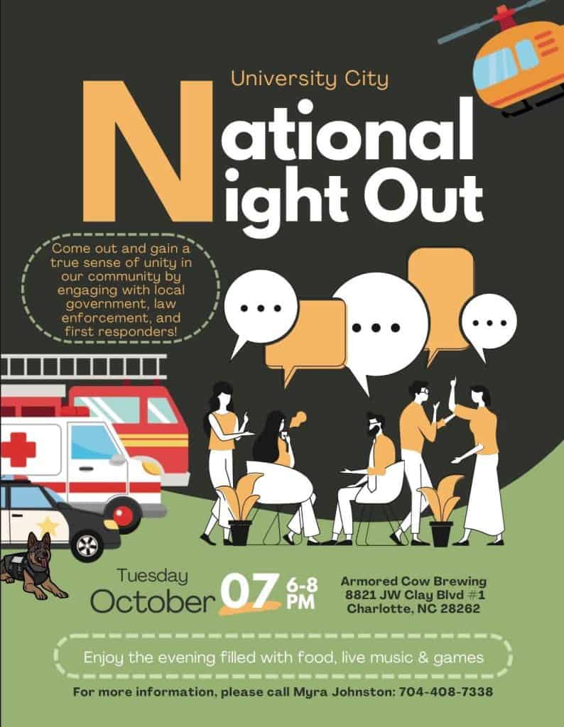 University City neighbors are coming together for their first-ever National Night Out on Tuesday, October 7, 2025, from 6 to 8 p.m., at Armored Cow Brewing, 8821 JW Clay Blvd, Charlotte, North Carolina.