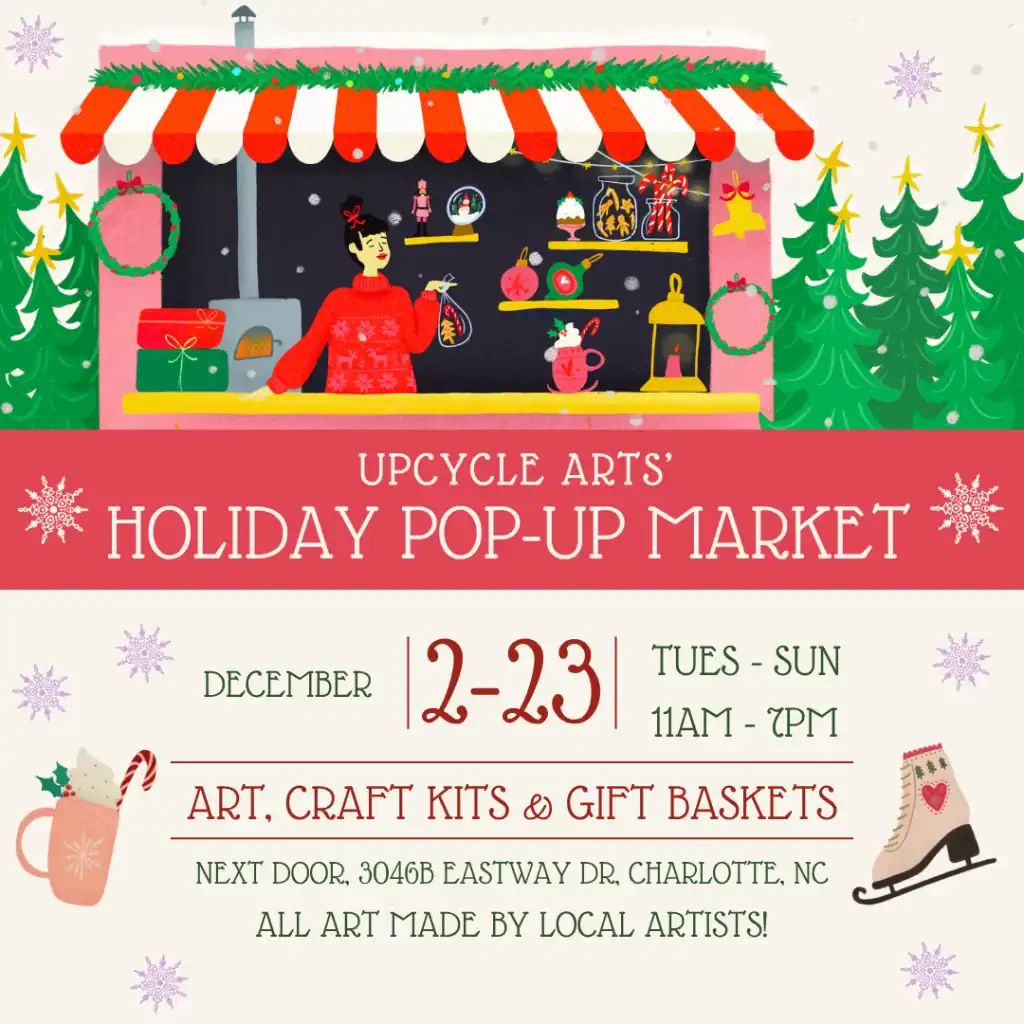 Upcycle Arts, Charlotte creative reuse center, is presenting a Holiday Pop-Up Market through much of December, 2025. It will be held right next door, at 3046B Eastway Drive, Charlotte, North Carolina.