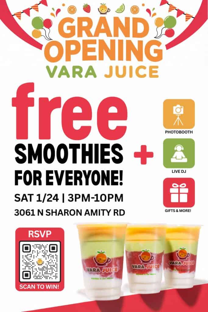 Vara Juice is opening at 3061 N Sharon Amity Road, Charlotte, North Carolina. Its grand opening is Saturday, January 24, 2026, from 3 to 10 p.m.