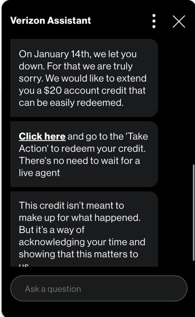 Verizon is offering a $20 credit per account on the bills of customers who were affected by the outage, but the catch is that you have to redeem the credit. Perhaps the motivation is that many people will not take the steps to claim the $20 credit.