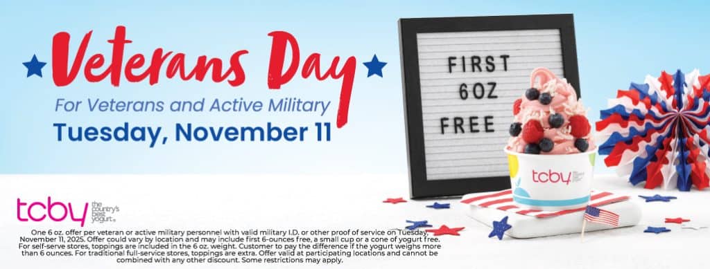 Participating TCBY locations are offering the first 6 oz. of free frozen yogurt to veterans and active military on Tuesday, November 11, 2025. For self-serve stores, toppings are included in the 6 oz. weight.