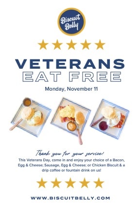 Veterans eat free at Biscuit Belly on Monday, November 11, 2025. Choose from Bacon Egg & Cheese, Sausage Egg & Cheese, and Chicken Biscuit Sandwich, and a hot drip coffee or fountain drink. All Biscuit Belly locations are participating. Dine in only. 1949 E 7th Street, Charlotte, NC.
