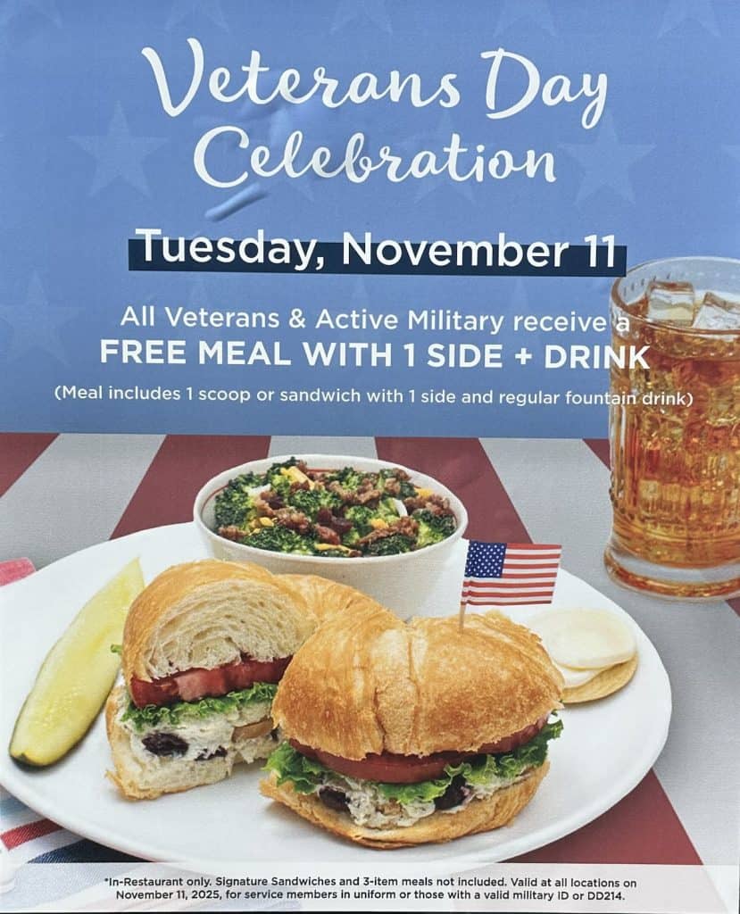Capriotti’s is offering veterans and active duty military a free small sub with any in-shop purchase on November 11, 2025, when presented a valid military ID. Participating locations only. Find locations here. Learn more in the press release.