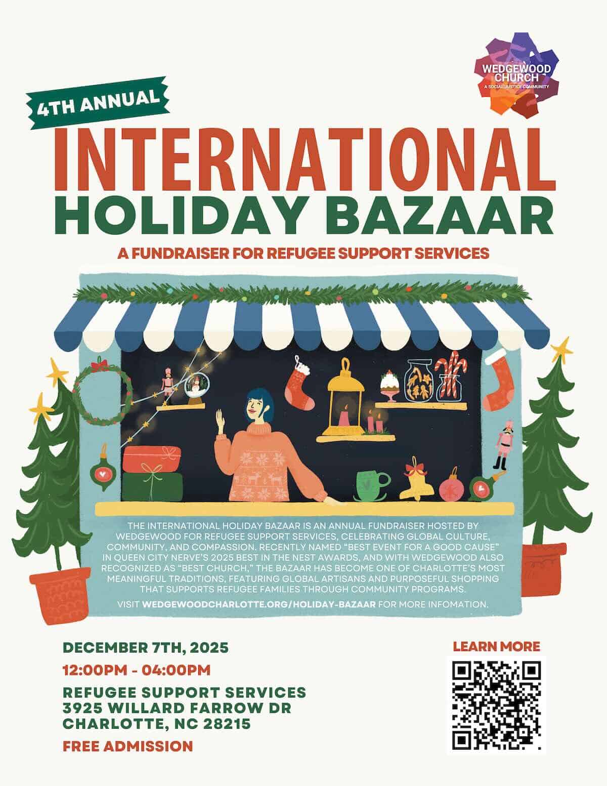 Wedgewood: A Social Justice Community is presenting the Fourth Annual International Bazaar. It will take place at Refugee Support Services, 3925 Willard Farrow Drive, Charlotte, North Carolina, on Sunday, December 7, 2025, from 12 to 4 p.m.