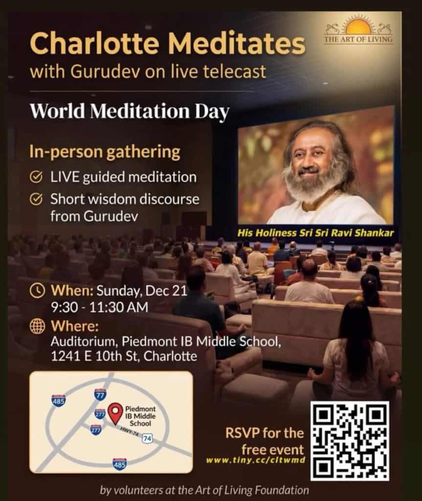 Celebrate World Meditation at a free live guided group meditation event on Sunday, December 21, 2025, from 9:30 to 11:30 a.m., at Piedmont IB Middle School, 1241 E 10th Street, Charlotte, North Carolina.
