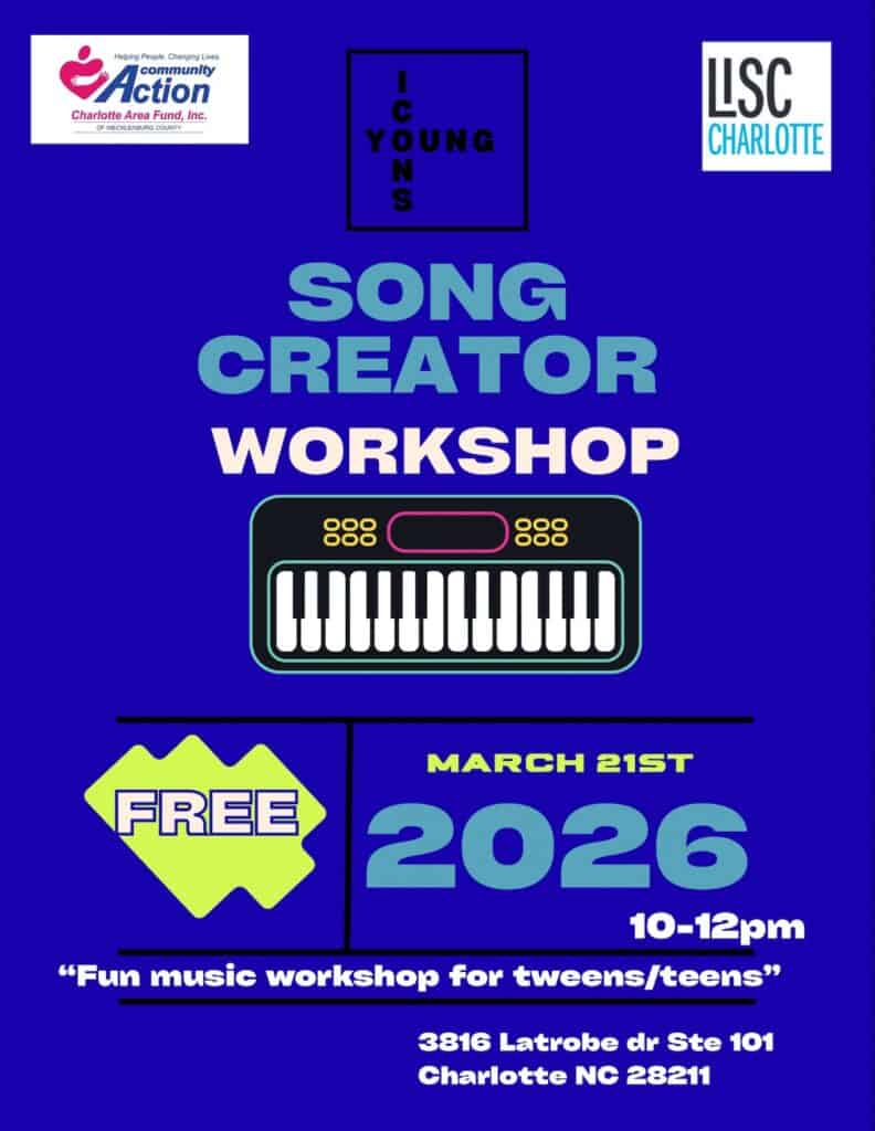 Young Icons and Charlotte Area Fund are offering a free music workshop for tweens and teens on Saturday, March 21, 2026, from 10 a.m. to 12 p.m., at Charlotte Area Fund, 3816 Latrobe Drive, Ste. 101, Charlotte, North Carolina.
